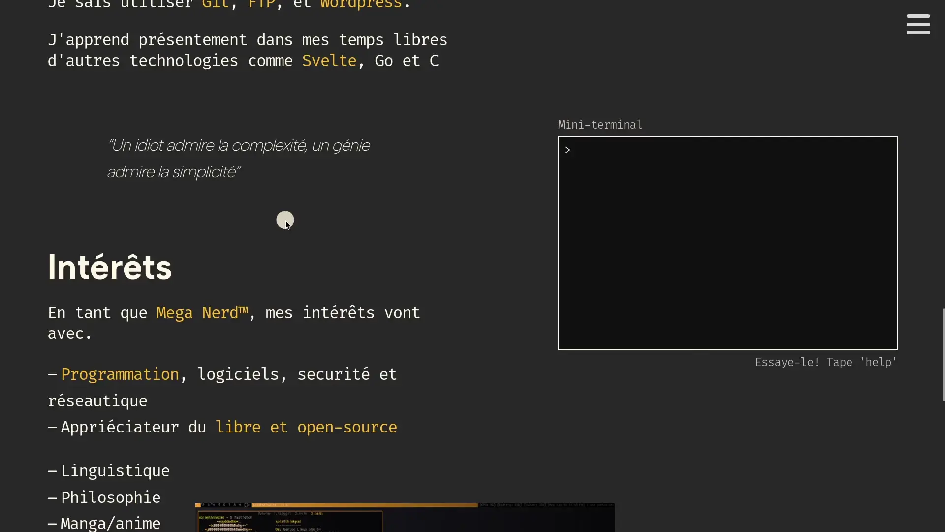 J'ai fait ce portfolio non seulement dans le but de montrer 		mes compétences, mais aussi mon amour de la programmation.